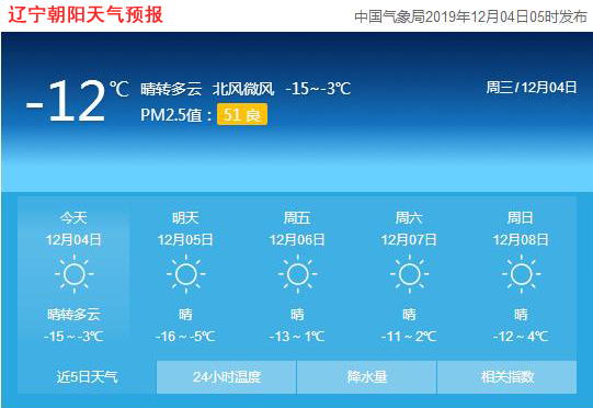 今天是2019年12月04日,星期三,農(nóng)歷十一月初九。遼寧朝陽(yáng)晴轉(zhuǎn)多云,氣溫-15~-3℃,東北風(fēng)微風(fēng),空氣質(zhì)量良好。日出時(shí)間:07:07;日落時(shí)間:16:29。(中國(guó)氣象局2019年12月04日05時(shí)發(fā)布)請(qǐng)隨時(shí)關(guān)注天氣變化。