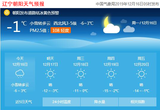 今天是2019年12月16日,星期一,農(nóng)歷十一月二十一。遼寧朝陽小雪轉(zhuǎn)多云,氣溫-6~3℃,西南風(fēng)3~5級,空氣質(zhì)量輕度污染。日出時(shí)間:07:17;日落時(shí)間:16:29(中國氣象局2019年12月16日5時(shí)發(fā)布),請隨時(shí)關(guān)注天氣變化。
