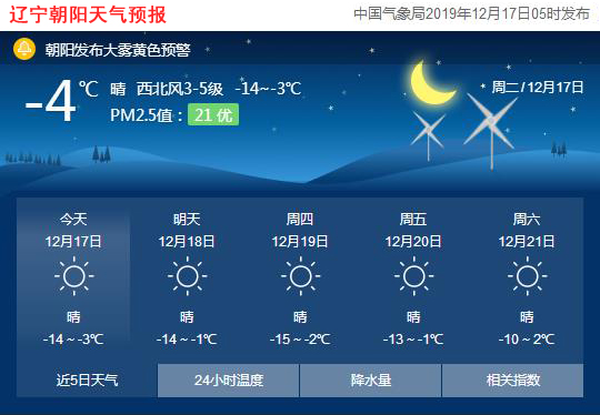 今天是2019年12月17日,星期二,農(nóng)歷十一月二十二。遼寧朝陽晴,氣溫-14~-3℃,西北風5~6級,空氣質量優(yōu)。日出時間:07:18;日落時間:16:29(中國氣象局2019年12月17日5時發(fā)布),請隨時關注天氣變化。