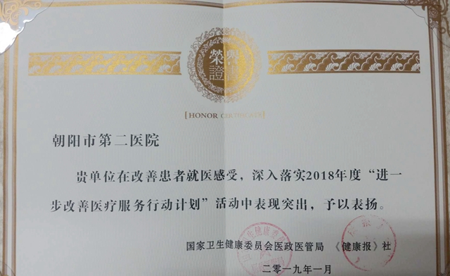 1月6日,一場(chǎng)令人矚目的衛(wèi)生健康盛會(huì)在北京舉行。在由國(guó)家衛(wèi)生健康委醫(yī)政醫(yī)管局和《健康報(bào)》社共同主辦的“2018年度改善醫(yī)療服務(wù)典型經(jīng)驗(yàn)交流推廣會(huì)”上,遼寧省朝陽(yáng)市第二醫(yī)院在改善患者就醫(yī)感受,深入落實(shí)2018年度“進(jìn)一步改善醫(yī)療服務(wù)行動(dòng)計(jì)劃”活動(dòng)中表現(xiàn)突出,被國(guó)家衛(wèi)健委授予“優(yōu)秀醫(yī)院”“優(yōu)秀科室”“優(yōu)秀個(gè)人”三項(xiàng)大獎(jiǎng)。
