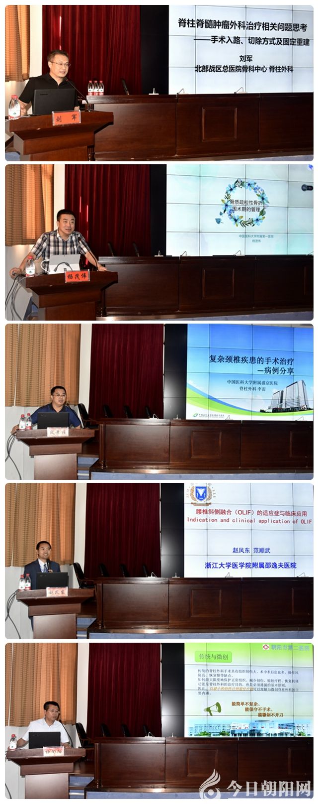 接下來,進入了學術講座環(huán)節(jié)。北部戰(zhàn)區(qū)總醫(yī)院骨科副主任劉軍、中國醫(yī)科大學附屬第一醫(yī)院骨科主任醫(yī)師楊茂偉、中國醫(yī)科大學附屬盛京醫(yī)院脊柱外科副主任醫(yī)師段景柱、浙江大學醫(yī)學院附屬邵逸夫醫(yī)院骨科副主任趙鳳東、市二院微創(chuàng)脊柱外科主任杜向陽5位專家,分別以《脊柱脊髓腫瘤外科治療相關問題思考》《骨質(zhì)疏松性骨折圍術期的管理》《復雜頸椎疾患的手術治療》《腰椎斜側(cè)融合(OLIF)的適應癥與臨床應用》《淺談椎間盤鏡技術(MED)在腰椎退變性疾病中的應用》為題,進行了精彩的講解。