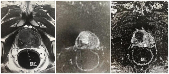 患者李某,家住朝陽市區(qū),因“尿頻、排尿困難進行性加重1年”來到泌尿外科就診,化驗結果顯示前列腺腫瘤標記物輕度升高,肛門指診無異常,建議住院進行系統(tǒng)檢查?;颊呷朐汉螅摽茖嵤┝硕鄥?shù)MRI檢查,發(fā)現(xiàn)前列腺中央腺異常信號,病灶距離外周腺體較遠,如進行常規(guī)系統(tǒng)經(jīng)直腸超聲引導穿刺,漏穿可能性非常高。在此情形下,該科在穿刺過程中通過多參數(shù)MRI圖像融合超聲影像精準定位病變區(qū),自由臂引導穿刺針準確到達病灶區(qū)域穿刺3針,后又行常規(guī)前列腺系統(tǒng)穿刺10針。術后,病理回報影像異常區(qū)域3針、病理2針為前列腺癌,其余均為前列腺增生。