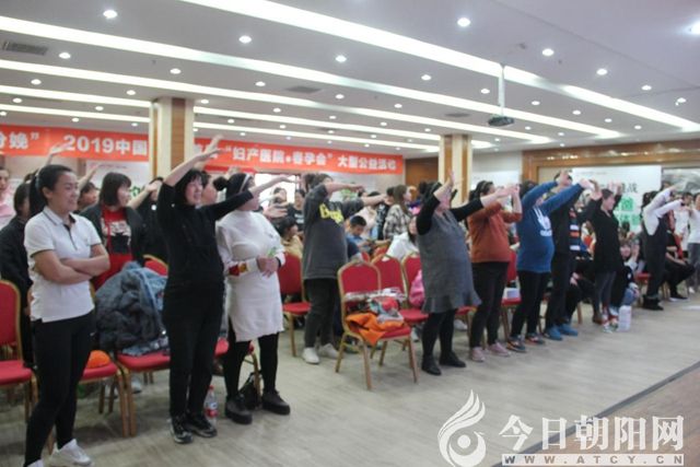 準(zhǔn)媽媽們?cè)跁?huì)場(chǎng)聽(tīng)音樂(lè)、練瑜伽、做孕婦操。