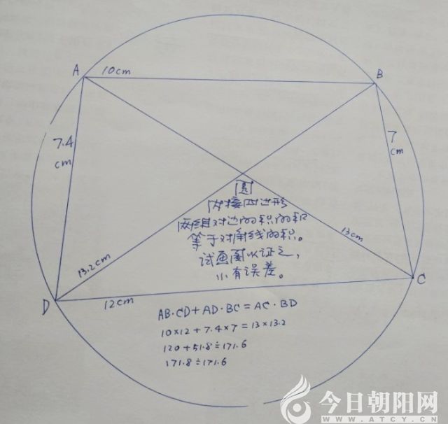 次日,青山一發(fā)找來一個(gè)圓形器皿蓋兒畫了個(gè)圓,拿刻度尺畫了個(gè)圓內(nèi)接四邊形,再畫上對角線,度量,計(jì)算,驗(yàn)證……不會證明就得實(shí)測。
