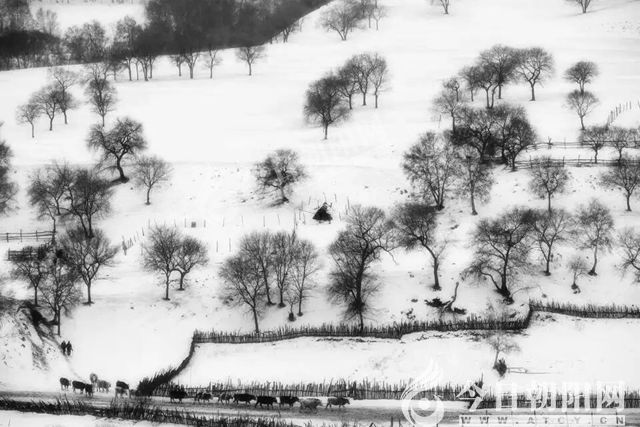 白雪潤(rùn)大漠,青枝秀婀娜。點(diǎn)點(diǎn)映水墨,遙遙歸踏歌。