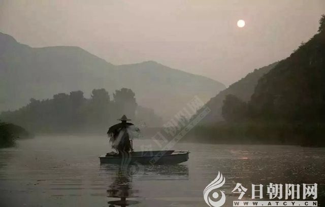 凌水清清,薄霧蒙蒙,孤舟蓑笠,移船而行。白云悠悠,旭日?qǐng)A圓,心存牽念,寄語(yǔ)山巒。