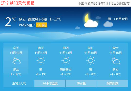 今天是2019年11月12日,星期二,農(nóng)歷十月十六。遼寧朝陽(yáng)多云,氣溫1~17℃,西南風(fēng)4~5級(jí),空氣質(zhì)量良好。日出時(shí)間:06:41;日落時(shí)間:16:42。(中國(guó)氣象局2019年11月12日05時(shí)發(fā)布。)請(qǐng)隨時(shí)關(guān)注天氣變化。