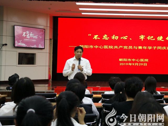 9月29日下午,遼寧省朝陽市中心醫(yī)院共產(chǎn)黨員與青年學(xué)子同慶新中國成立七十周年大會(huì)在該院外科樓四樓報(bào)告廳舉行。市衛(wèi)健委相關(guān)領(lǐng)導(dǎo)及“不忘初心、牢記使命”主題教育第一巡回指導(dǎo)組成員、醫(yī)院領(lǐng)導(dǎo)班子成員、全體黨員和實(shí)習(xí)生參加了活動(dòng)。活動(dòng)現(xiàn)場歌聲飛揚(yáng)、舞姿蹁躚,不僅抒發(fā)了濃濃的愛國情懷,還點(diǎn)燃了醫(yī)務(wù)工作者在新時(shí)代做好醫(yī)療衛(wèi)生工作的豪情壯志。