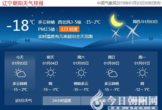 今天是2019年1月3日,星期四,農(nóng)歷十一月二十八。遼寧朝陽晴,氣溫-15~2℃,西北風(fēng)3~5級(jí),空氣有輕度污染,敏感人員外出時(shí)需做好防護(hù)措施。日出時(shí)間:07:25;日落時(shí)間:16:39。