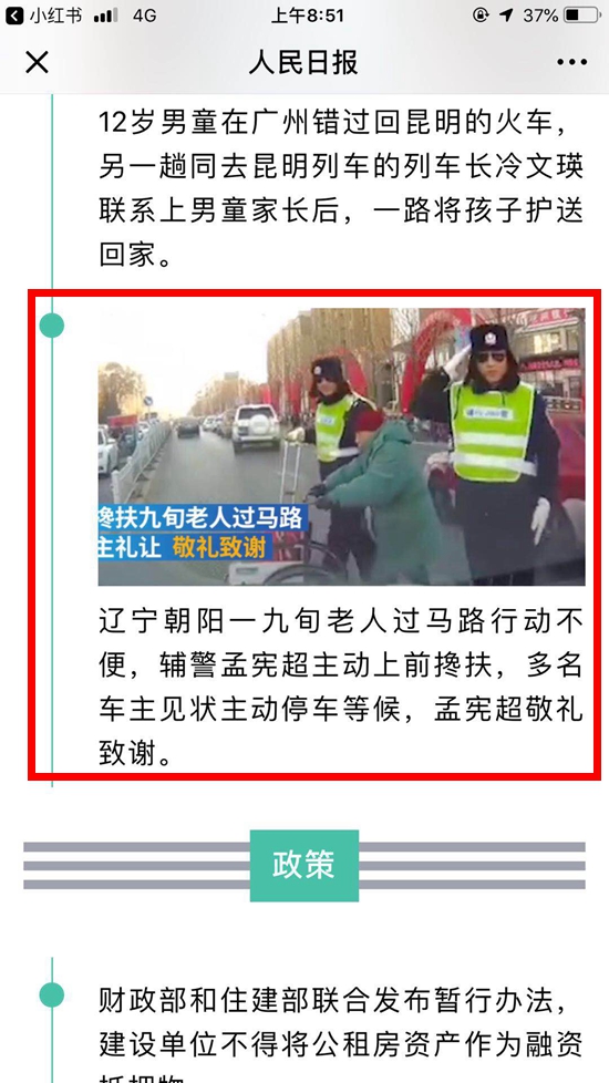 據(jù)小編了解,事情的經(jīng)過是這樣的。2019年1月19日,遼寧省朝陽市公安局交警支隊(duì)鐵騎隊(duì)在天馬時(shí)代廣場周邊執(zhí)行安保任務(wù)。上午9時(shí)50分許,執(zhí)勤民警王志芳發(fā)現(xiàn)一位高齡老人雙手推著輪椅步履蹣跚,行走十分緩慢。見老人準(zhǔn)備過斑馬線且來往車量較多,王志芳立即跑到跟前,扶著老人行走。此時(shí),正在巡邏的鐵騎隊(duì)輔警孟憲超見狀也趕過來幫忙,一同護(hù)送老人過斑馬線。
