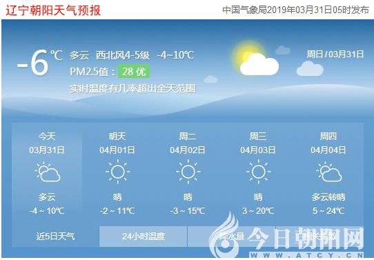 今天是2019年3月31日,星期日,農(nóng)歷二月二十五。遼寧朝陽多云,氣溫-4~10℃,西北風(fēng)4~5級(jí),空氣質(zhì)量優(yōu)。日出時(shí)間:05:46;日落時(shí)間:18:21。
