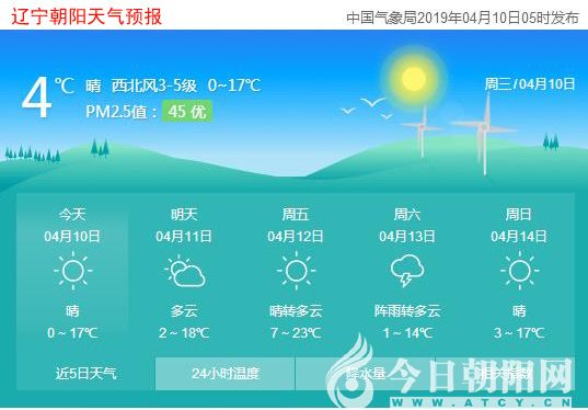 今天是2019年4月10日,星期三,農(nóng)歷三月初六。遼寧朝陽晴,氣溫0~17℃,西風(fēng)3~5級,空氣質(zhì)量優(yōu)。日出時間:05:30;日落時間:18:32。