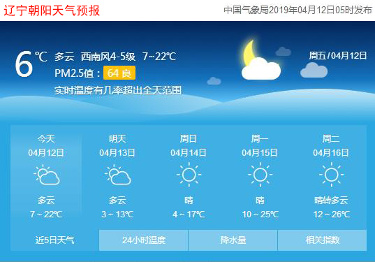 今天是2019年4月12日,星期五,農(nóng)歷三月初八。遼寧朝陽(yáng)多云,氣溫7~22℃,西南風(fēng)4~5級(jí),空氣質(zhì)量良好。日出時(shí)間:05:26;日落時(shí)間:18:34。