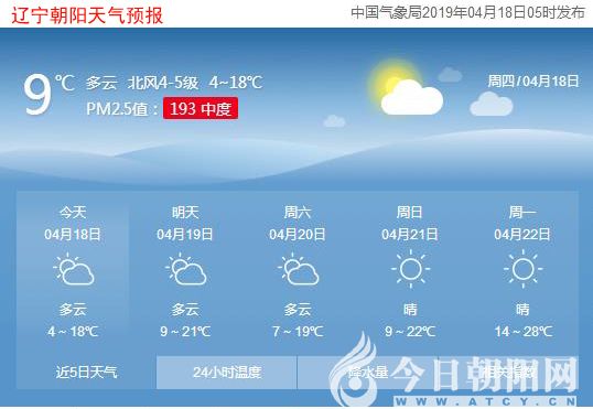 今天是2019年4月18日,星期四,農(nóng)歷三月十四。遼寧朝陽多云,氣溫4~18℃,北風(fēng)4~5級(jí),空氣質(zhì)量中度污染,大家外出時(shí),需做好防護(hù)措施。日出時(shí)間:05:17;日落時(shí)間:18:41。