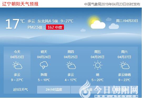 今天是2019年4月23日,星期二,農(nóng)歷三月十九。遼寧朝陽多云,氣溫9~27℃,東北風(fēng)4~5級,空氣質(zhì)量中度污染,大家外出時,需做好防護(hù)措施。日出時間:05:10;日落時間:18:46。
