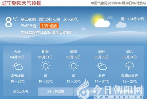 今天是2019年4月30日,星期二,農(nóng)歷三月二十六。遼寧朝陽(yáng)多云轉(zhuǎn)晴,氣溫10~20℃,西北風(fēng)4~5級(jí),空氣質(zhì)量輕度污染,敏感人群外出時(shí),需做好防護(hù)措施。日出時(shí)間:04:59;日落時(shí)間:18:54。