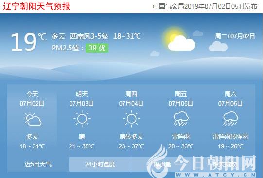 今天是2019年7月2日,星期二,農(nóng)歷五月三十。遼寧朝陽(yáng)多云,氣溫18~31℃,西南風(fēng)3~5級(jí),空氣質(zhì)量?jī)?yōu)。日出時(shí)間:04:27;日落時(shí)間:19:36。(數(shù)據(jù)來(lái)源于中國(guó)氣象局2019年07月2日5時(shí)發(fā)布,請(qǐng)隨時(shí)關(guān)注天氣變化)