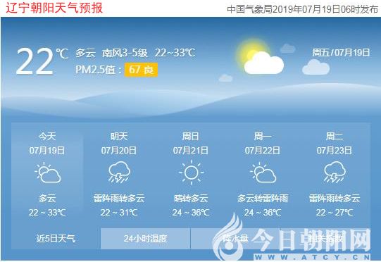 今天是2019年7月19日,星期五,農(nóng)歷六月十七,初伏第八天。遼寧朝陽多云,氣溫22~33℃,南風(fēng)3~5級,空氣質(zhì)量良好。日出時(shí)間:04:39;日落時(shí)間:19:29。(數(shù)據(jù)來源于中國氣象局2019年07月19日06時(shí)發(fā)布,請隨時(shí)關(guān)注天氣變化)