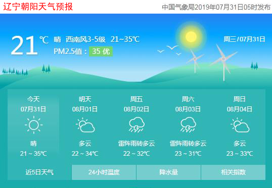 今天是2019年7月31日,星期三,農(nóng)歷六月二十九,中伏第十天。遼寧朝陽晴,氣溫21~35℃,西南風(fēng)3~5級,空氣質(zhì)量優(yōu)。日出時間:04:50;日落時間:19:18。(數(shù)據(jù)來源于中國氣象局2019年07月30日05時發(fā)布,請隨時關(guān)注天氣變化)