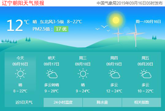 今天是2019年9月16日,星期一,農(nóng)歷八月十八。遼寧朝陽(yáng)晴,氣溫8~22℃,東北風(fēng)3~5級(jí),空氣質(zhì)量?jī)?yōu)。日出時(shí)間:05:37;日落時(shí)間:18:08。(數(shù)據(jù)來源于中國(guó)氣象局2019年09月16日05時(shí)發(fā)布,請(qǐng)隨時(shí)關(guān)注天氣變化。)