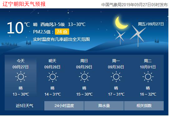 今天是2019年9月27日,星期五,農(nóng)歷八月二十九。遼寧朝陽(yáng)多云,氣溫13~30℃,西南風(fēng)3~5級(jí),空氣質(zhì)量良好。日出時(shí)間:05:49;日落時(shí)間:17:49。(數(shù)據(jù)來源于中國(guó)氣象局2019年09月27日05時(shí)發(fā)布,請(qǐng)隨時(shí)關(guān)注天氣變化。)