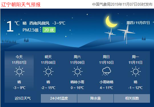 今天是2019年11月7日,星期四,農(nóng)歷十月十一。遼寧朝陽晴,氣溫-3~9℃,西北風(fēng)3~5級,空氣質(zhì)量優(yōu)。日出時間:06:35;日落時間:16:48。(中國氣象局2019年11月07日05時發(fā)布。)請隨時關(guān)注天氣變化。