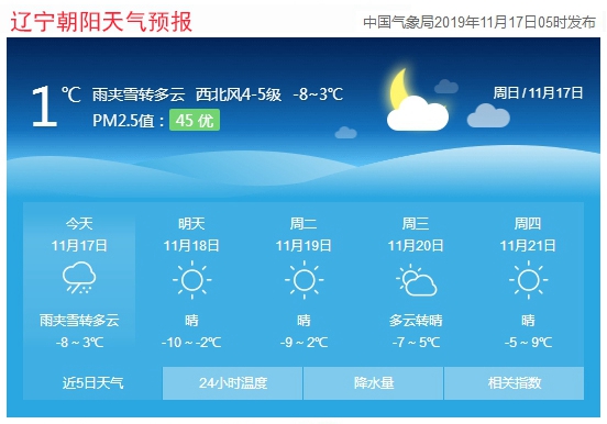今天是2019年11月17日,星期日,農(nóng)歷十月二十一。遼寧朝陽雨夾雪轉(zhuǎn)多云,氣溫-8~3℃,西南風(fēng)3~5級,空氣質(zhì)量優(yōu)。日出時間:06:46;日落時間:16:38。(中國氣象局2019年11月17日05時發(fā)布)請隨時關(guān)注天氣變化。