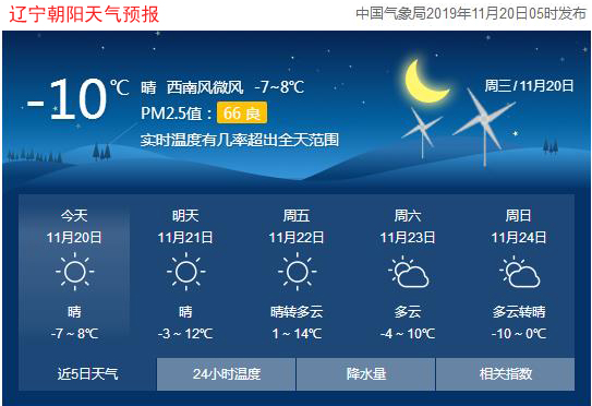 今天是2019年11月20日,星期三,農(nóng)歷十月二十四。遼寧朝陽(yáng)晴,氣溫-7~8℃,西南風(fēng)3~5級(jí),空氣質(zhì)量良好。日出時(shí)間:06:51;日落時(shí)間:16:35。(中國(guó)氣象局2019年11月20日05時(shí)發(fā)布)請(qǐng)隨時(shí)關(guān)注天氣變化。