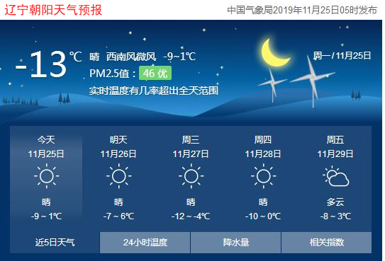 今天是2019年11月25日,星期一,農(nóng)歷十月二十九。遼寧朝陽(yáng)晴,氣溫-9~1℃,西南風(fēng)3~5級(jí),空氣質(zhì)量?jī)?yōu)。日出時(shí)間:06:57;日落時(shí)間:16:32。(中國(guó)氣象局2019年11月25日05時(shí)發(fā)布)請(qǐng)隨時(shí)關(guān)注天氣變化。