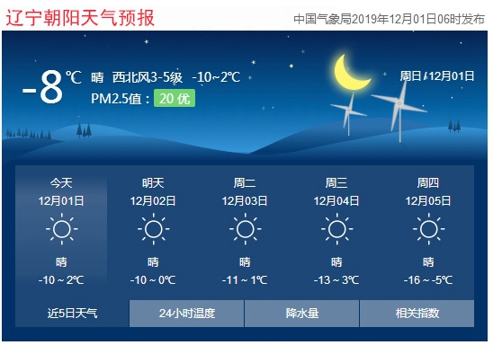 今天是2019年12月1日,星期日,農(nóng)歷十一月初六。遼寧朝陽晴,氣溫-10~2℃,西南風(fēng)微風(fēng),空氣質(zhì)量優(yōu)。日出時間:07:03;日落時間:16:29。(中國氣象局2019年12月01日06時發(fā)布)請隨時關(guān)注天氣變化。