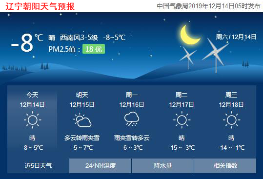 今天是2019年12月14日,星期六,農(nóng)歷十一月十九。遼寧朝陽晴,氣溫-8~5℃,西南風(fēng)4~5級,空氣質(zhì)量優(yōu)。日出時間:07:16;日落時間:16:28(中國氣象局2019年12月14日5時發(fā)布),請隨時關(guān)注天氣變化。
