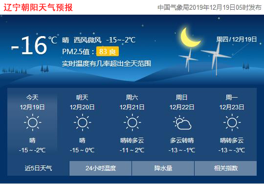 今天是2019年12月19日,星期四,農(nóng)歷十一月二十四。遼寧朝陽(yáng)晴,氣溫-15~-2℃,西北風(fēng)3~5級(jí),空氣質(zhì)量良好。日出時(shí)間:07:19;日落時(shí)間:16:30(中國(guó)氣象局2019年12月19日5時(shí)發(fā)布),請(qǐng)隨時(shí)關(guān)注天氣變化。