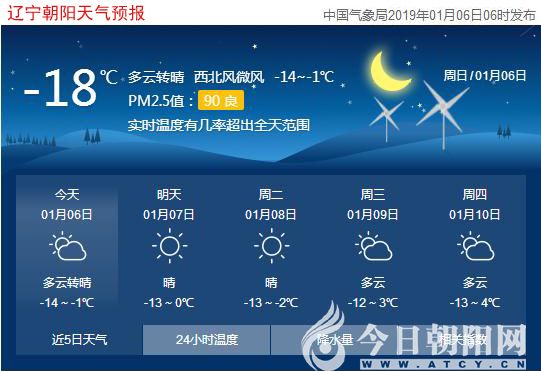 今天是2019年1月6日,星期日。遼寧朝陽(yáng)多云轉(zhuǎn)晴,氣溫-14~-1℃,西北風(fēng)微風(fēng),空氣質(zhì)量良好。寒冷程度屬于當(dāng)季正常水平,大家穿得稍微暖和一點(diǎn),就可以去外面玩耍啦!