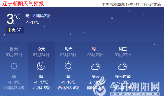 今天是2019年3月24日,星期日,農(nóng)歷二月十八。遼寧朝陽晴,氣溫-1~17℃,西風(fēng)4~5級,空氣質(zhì)量良好。日出時間:05:58;日落時間:18:14。