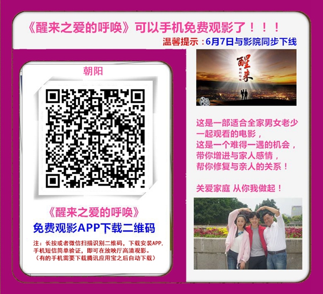 溫馨提示:掃描上方遼寧朝陽(yáng)地區(qū)的二維碼,下載“移動(dòng)影院”APP,可以免費(fèi)在線觀看《醒來之愛的呼喚》。注意首次觀看一定要連續(xù)看夠7分鐘,然后其他任何時(shí)間觀看才都是免費(fèi)的,福利截止到6月7日。