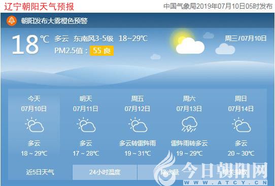 今天是2019年7月10日,星期三,農(nóng)歷六月初八。遼寧朝陽多云,氣溫18~29℃,南風(fēng)3~5級,空氣質(zhì)量良好。日出時間:04:32;日落時間:19:34。(數(shù)據(jù)來源于中國氣象局2019年07月10日05時發(fā)布,請隨時關(guān)注天氣變化)