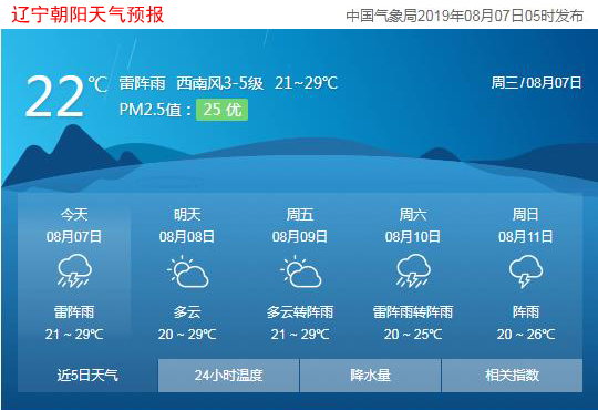 今天是2019年8月7日,星期三,農(nóng)歷七月初七,中國(guó)民間的傳統(tǒng)節(jié)日七夕節(jié),中伏第十七天。遼寧朝陽(yáng)雷陣雨,氣溫21~29℃,西南風(fēng)3~5級(jí),空氣質(zhì)量?jī)?yōu)。日出時(shí)間:04:57;日落時(shí)間:19:10。(數(shù)據(jù)來(lái)源于中國(guó)氣象局2019年08月07日05時(shí)發(fā)布,請(qǐng)隨時(shí)關(guān)注天氣變化。)