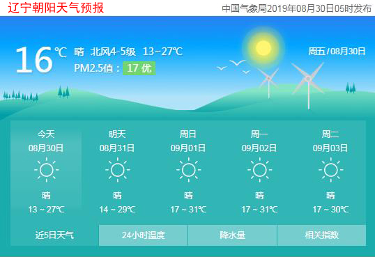 今天是2019年8月30日,星期五,農(nóng)歷八月初一。遼寧朝陽晴,氣溫13~27℃,北風(fēng)4~5級(jí),空氣質(zhì)量優(yōu)。日出時(shí)間:05:20;日落時(shí)間:18:37。(數(shù)據(jù)來源于中國氣象局2019年08月30日05時(shí)發(fā)布,請(qǐng)隨時(shí)關(guān)注天氣變化。)