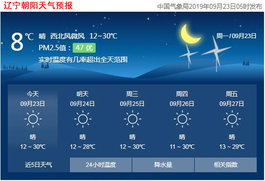 今天是2019年9月23日,星期一,農歷八月二十五。遼寧朝陽晴,氣溫12~30℃,西南風微風,空氣質量優(yōu)。日出時間:05:44;日落時間:17:56。(數(shù)據(jù)來源于中國氣象局2019年09月23日05時發(fā)布,請隨時關注天氣變化。)