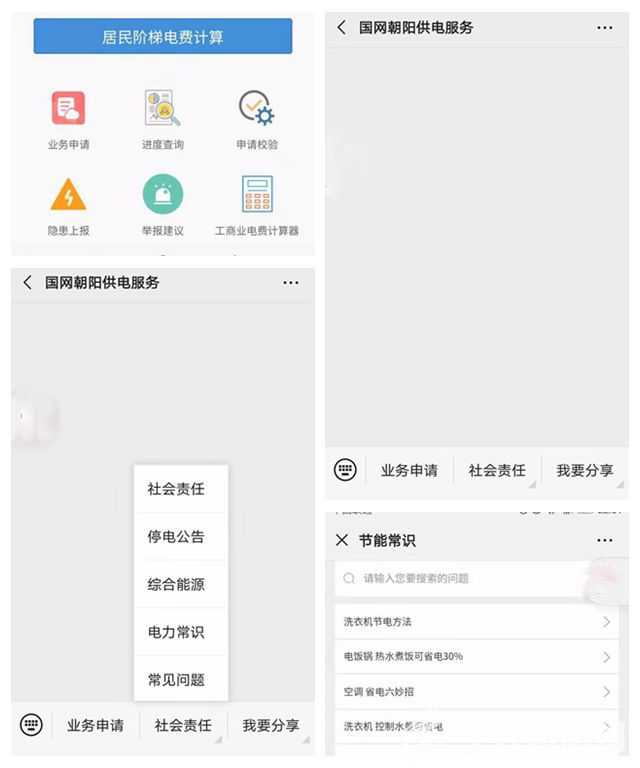 打開“國網(wǎng)朝陽供電服務(wù)”微信公眾號,就能看到業(yè)務(wù)申請、社會責任、我要分享三個選項。點進業(yè)務(wù)申請欄,居民階梯電費計算、業(yè)務(wù)申請、申請校驗、隱患上報等功能選項就會映入眼簾;在社會責任欄里,您可以及時查看到實用的用電信息,如停電公告,電力常識等等。