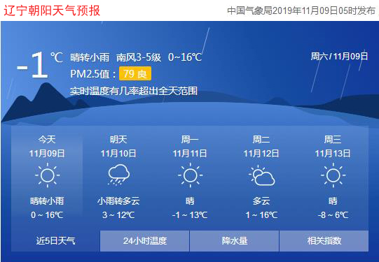 今天是2019年11月9日,星期六,農(nóng)歷十月十三。遼寧朝陽(yáng)晴轉(zhuǎn)小雨,氣溫0~16℃,西南風(fēng)3~5級(jí),空氣質(zhì)量良好。日出時(shí)間:06:37;日落時(shí)間:16:45。(中國(guó)氣象局2019年11月09日05時(shí)發(fā)布。)請(qǐng)隨時(shí)關(guān)注天氣變化。