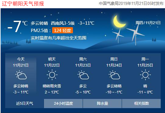 今天是2019年11月21日,星期四,農(nóng)歷十月二十五。遼寧朝陽(yáng)晴,氣溫-3~11℃,西南風(fēng)4~5級(jí),空氣質(zhì)量輕度污染。日出時(shí)間:06:52;日落時(shí)間:16:35。(中國(guó)氣象局2019年11月21日05時(shí)發(fā)布)請(qǐng)隨時(shí)關(guān)注天氣變化。