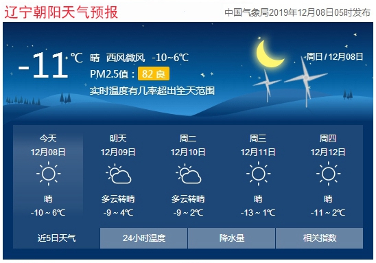 今天是2019年12月8日,星期日,農(nóng)歷十一月十三。遼寧朝陽(yáng)晴,氣溫-10~6℃,西南風(fēng)3~5級(jí),空氣質(zhì)量良好。日出時(shí)間:07:10;日落時(shí)間:16:28。(中國(guó)氣象局2019年12月8日05時(shí)發(fā)布)請(qǐng)隨時(shí)關(guān)注天氣變化。
