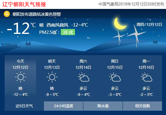 今天是2019年12月12日,星期四,農(nóng)歷十一月十七。遼寧朝陽晴,氣溫-12~4℃,西南風(fēng)微風(fēng),空氣質(zhì)量?jī)?yōu)。日出時(shí)間:07:14;日落時(shí)間:16:28(中國(guó)氣象局2019年12月12日5時(shí)發(fā)布),請(qǐng)隨時(shí)關(guān)注天氣變化。