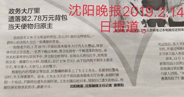 新春伊始,暖意漸濃,來自遼寧朝陽安平集團的暖心事更是一件接著一件。1月22日,該集團駐沈陽市于洪區(qū)政務(wù)服務(wù)中心保安員徐世武拾金不昧的事跡被遼寧都市頻道報道后,又登在了遼沈晚報上。報紙被沈陽市政府文明辦有關(guān)負(fù)責(zé)人看到后非常重視,認(rèn)為這種社會正能量應(yīng)該重視和宣揚,就特別聯(lián)系于洪區(qū)政府的領(lǐng)導(dǎo),安排遼寧經(jīng)濟頻道《直播生活》欄目的記者再次采訪。然而,就在記者采訪剛結(jié)束、還沒出去服務(wù)大廳時,該集團保安員李同順又拾到一個錢包……