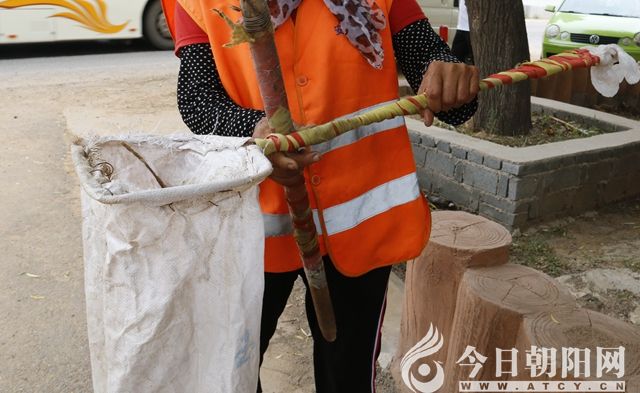 李素英向小編展示兒子為她做的清掃工具
