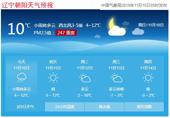 今天是2019年11月10日,星期日,農(nóng)歷十月十四。遼寧朝陽(yáng)小雨轉(zhuǎn)多云,氣溫4~12℃,西南風(fēng)3~5級(jí),空氣質(zhì)量重度污染,出門(mén)的朋友要做好防護(hù)。日出時(shí)間:06:39;日落時(shí)間:16:44。(中國(guó)氣象局2019年11月10日05時(shí)發(fā)布。)請(qǐng)隨時(shí)關(guān)注天氣變化。