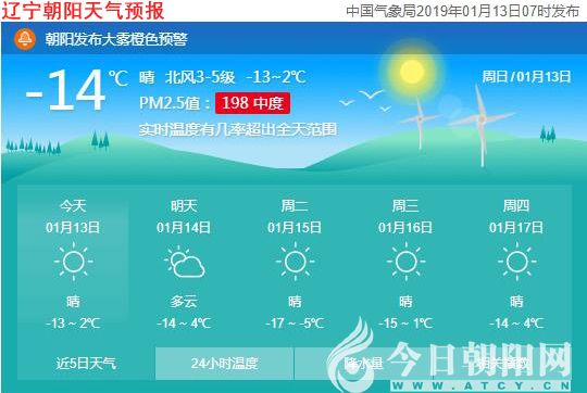 今天是2019年1月13日,星期日,“三九”第五天。遼寧朝陽晴,氣溫-13~2℃,北風(fēng)3~5級,空氣質(zhì)量中度污染,大家外出時,需做好保護(hù)措施。日出時間:07:24;日落時間:16:49。