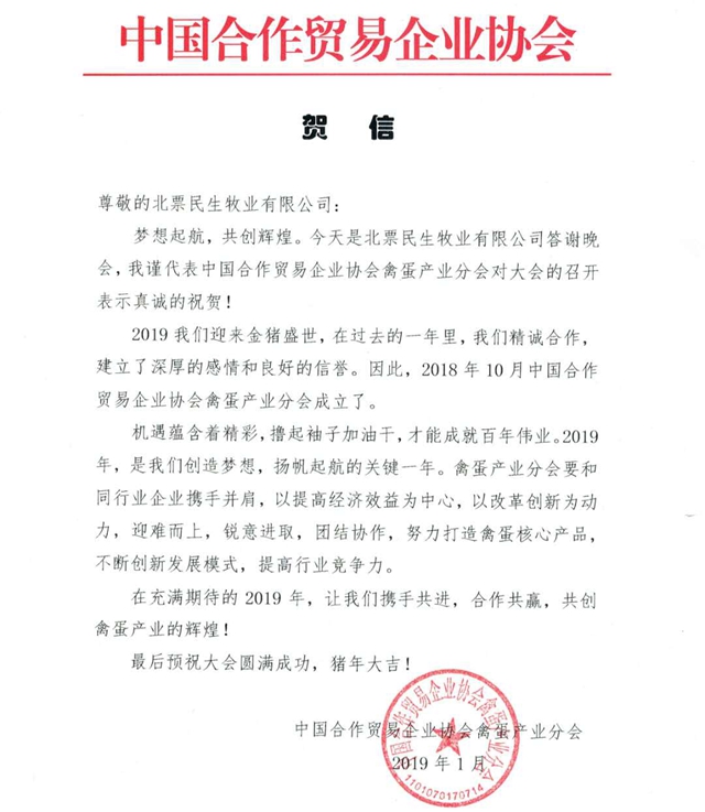 然而,1月26日晚,在北票南山某飯店舉行的民生牧業(yè)公司2018答謝晚會,卻因為公司總經(jīng)理閆一迪情深義重的一聲“謝謝”,因為中國合作貿(mào)易企業(yè)協(xié)會激情滿懷的一封賀信,因為北京市蛋品加工銷售行業(yè)協(xié)會秘書長、農(nóng)業(yè)部農(nóng)產(chǎn)品加工專家委員會委員、新華社特約經(jīng)濟分析師王忠強一番有理有據(jù)的行業(yè)形勢分析,因為美菜網(wǎng)全國蛋品負責人王兆位高調(diào)宣布的與民生集團精誠合作的一組數(shù)據(jù),更因為“2018年民生牧業(yè)公司銷售雞蛋94500噸、銷售額7.74億元”這個特大喜訊,立馬讓人感覺北京與北票的關(guān)聯(lián)度、黏合度乃至融合度竟然這么高!