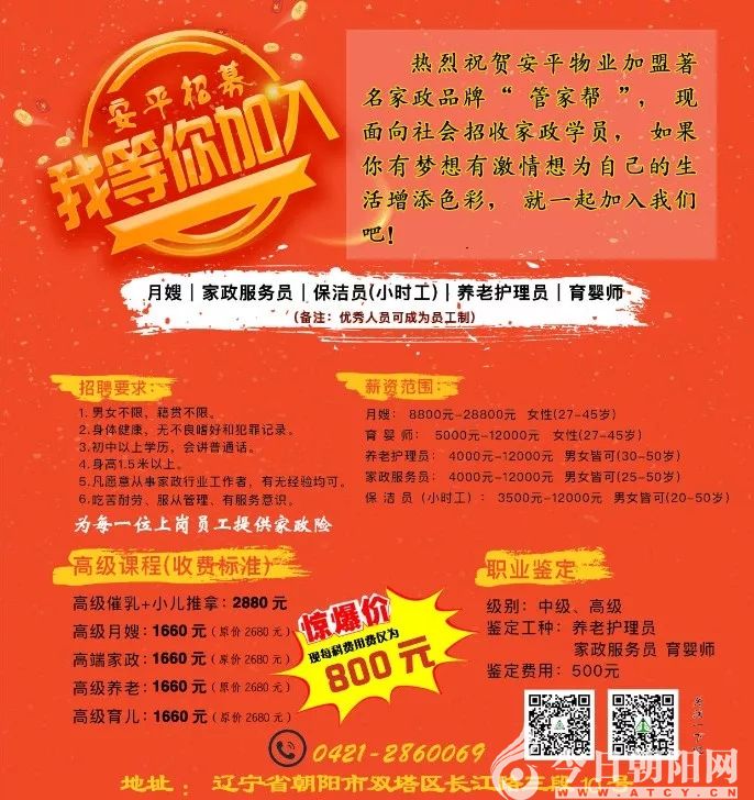 近日,一則喜訊從遼寧朝陽(yáng)安平集團(tuán)傳來(lái),該集團(tuán)的朝陽(yáng)安平物業(yè)管理有限公司加盟了著名家政品牌“管家?guī)?rdquo;。目前,安平物業(yè)正面向社會(huì)招收家政學(xué)員,為學(xué)員提供更專業(yè)更前衛(wèi)的系統(tǒng)培訓(xùn)。悄悄地告訴您,春節(jié)期間優(yōu)惠力度很大喲,詳細(xì)了解一下吧。